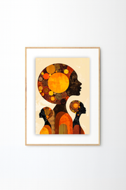 Make a bold statement with this Afro Abstract Wall Art, featuring expressive Afro silhouettes layered with warm tones, circular patterns, and textured design elements. The artwork highlights individuality, thought, and modern Afro style through a balanced blend of orange, gold, and deep brown hues.