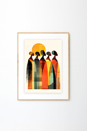 This Afro-Bohemian wall art celebrates unity, identity, and feminine strength through a harmonious lineup of silhouetted figures set against a glowing sun. Rendered in warm earth tones—burnt orange, mustard yellow, deep green, terracotta, and charcoal—this piece evokes African heritage while maintaining a modern boho aesthetic.