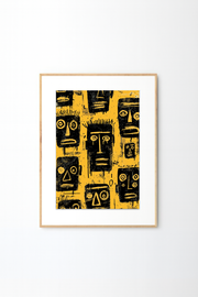 Make a powerful statement with this striking Afro Urban Mask Art Print, featuring bold black tribal-inspired faces set against a vibrant mustard yellow background. With its raw texture, expressive linework, and contemporary abstract style, this artwork blends African cultural influence with modern urban aesthetics.