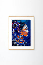 This bold Afrocentric portrait wall art features a stylized side profile enriched with intricate patterns, symbolic adornments, and a striking blue and orange color palette. The layered textures and graphic detailing celebrate cultural identity, strength, and modern artistic expression.