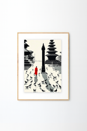 Capture the timeless spirit of Kathmandu with this striking graphic art print. Featuring a solitary figure in a bold red coat standing amidst a flock of pigeons in a historic Himalayan temple square, this piece offers a stunning contrast of solitude and movement. The high-contrast black and white architecture is punctuated by the single splash of red, making it a perfect conversation piece for a modern living room or hallway.