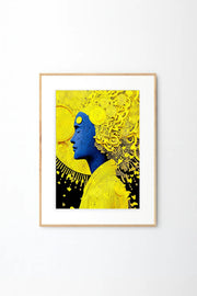 This striking Afrocentric abstract portrait features a bold side profile rendered in rich blue tones, layered with intricate golden textures and symbolic patterns. The vibrant yellow backdrop and detailed line work evoke themes of identity, heritage, and cultural expression, blending modern artistry with ancestral influence.