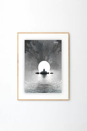 This modern sacred landscape wall art features a serene stupa centered within a luminous circular form, reflected across a calm water surface. Rendered in fine monochrome line work, the composition evokes stillness, balance, and spiritual contemplation.