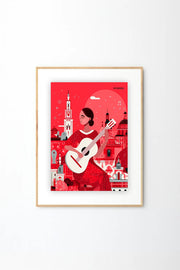 This vibrant wall art features a stylized flamenco guitarist set against a rich red cityscape inspired by Spanish architecture. Flowing shapes, musical details, and bold color tones capture the rhythm, passion, and cultural spirit of traditional flamenco music.
